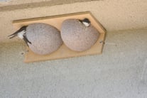 Die ersten neugierigen Mehlschwalben inspizieren die künstlichen Nester die gerne von ihnen angenommen werden.