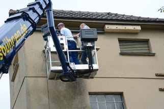 Hublift mit Alfred Glener und Markus Thies beim anbringen von Mehlschwalbenkästen.