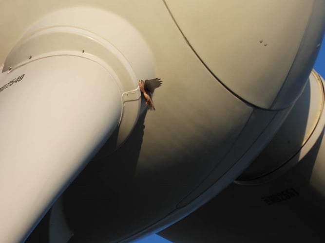 Turmfalke fliegt im laufenden Betrieb auf Rotorblatt Foto: H&B Beyerlein/NABU Euskirchen)