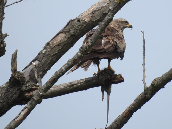Das Naturschutzgebiet beherbergt mittig im Schilfgebiet den alten Horstbaum der Schwarzmilane. Auch in diesem Jahr war zu beobachten, wie ein Jungtier von den Eltern mit Nahrung versorgt wurde. Mit lauten Rufen wurde das Nagetier auf dem Totholz-Baum übergeben.
