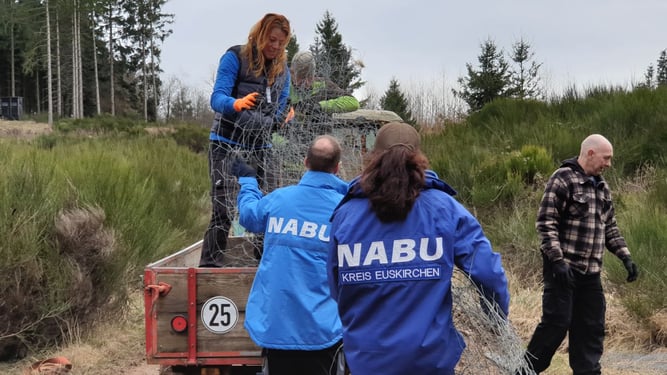 Der NABU Kreis Euskirchen und die Kreisjägerschaft Euskirchen haben am Wochenende in einer gemeinsamen Aktion eine ca. 40.000 qm große Waldfläche von ihrer Knotengeflecht-Umzäunung befreit und ermöglichen so den waldlebenden Tierarten, wie Rotwild (Cervus elaphus),Rehwild (Cervus capreolus), Fuchs (Vulpes vulpes), Dachs (Meles meles), Feldhase (Lepus europaeus) und Wildkatze (Felis silvestris silvestris) sowie den Greifvögeln und Eulenarten eine gefahrlose Nutzung der Waldfläche.