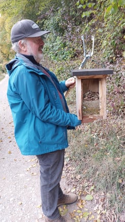 Georg Faber Aktives NABU-Mitglied zeigt einen Nistkasten, darin hat vermutlich eine Haselmaus über dem Meisennest ein Schlafnest gebaut und
