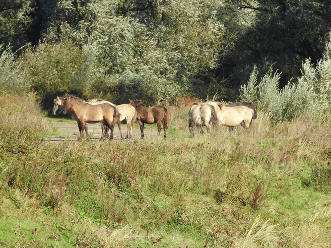 Das Areal ist gänzlich umzäunt und nicht wie oft in deutschen Tongruben einzelne Parzellen unterteilt, in denen die Beweidung stattfindet. So wandert man im weitläufigen Gelände und steht plötzlich inmitten einer kleinen Herde von Konikherde, die sich auf einem Damm sonnt.