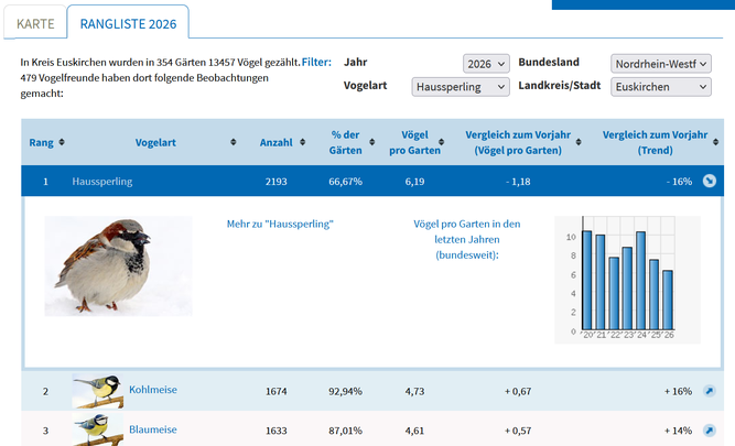 Um die vollständige Liste der Ergebnisse für den Kreis Euskirchen zu sehen, klicken Sie auf die unten stehende Grafik. Sie werden dann auf die Ergebnisseite des NABU Bundesverbandes geleitet: