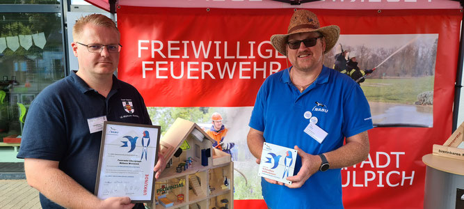 Auf Initiative des Löschgruppenführers, Herrn Kneisel, wurden vor Jahren am Löschhaus der Gruppe Schwalbennester und Kotbretter angebracht. Anlässlich der Aktionstages der Feuerwehrgruppe konnten wir im Beisein ihres Dienstherrn, dem Zülpicher Bürgermeister Ulf Hürtgen, die Löschgruppe als schwalbenfreundlich auszeichnen. Wir konnten uns vom NABU über die umfangreichen Tätigkeiten und die Einsatzbereitschaft der Mülheim-Wichtericher Feuerwehr für ihre Mitbürger, und ihre Freundlichkeit für die Mitbewohner am Feuerwehrhaus überzeugen und freuen uns, die ehrenamtlichen Kollegen auszeichnen zu können.