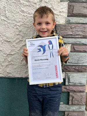 Jetzt, am 09. Juli 2022 hatten Norbert Pütz und Günter Lessenich vom NABU Euskirchen das große Vergnügen jemandem von der anderen Seite der Altersskala die Auszeichnung für das schwalbenfreundliche Haus zu überreichen. David Wassong wohnt in Uedelhoven und zählt mit 4 Jahren sicher zu den jüngsten Schwalbenfreunden Nordrhein-Westfalens. ...mehr