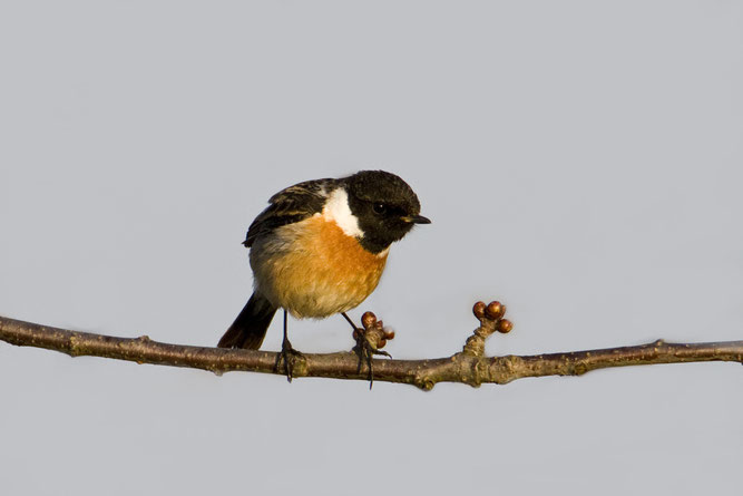 Wenn das hübsche Männchen des Schwarzkehlchens sein mit kratzenden Tönen durchsetztes Liedchen singt, fliegt es tanzend in geringer Höhe über sein Revier in der Heidelandschaft auf und nieder oder jagt in schnellem Balz Flug dem Weibchen nach. Sitzt es aber auf seinem Singposten, auf einer Buschspitze oder einem Telegraphendraht, dann dauert sein Lied nur wenige Sekunden. Dabei wippt es beständig mit dem Schwanz und ruft zwischen den einzelnen Strophen laut sein schroffes heiseres...
