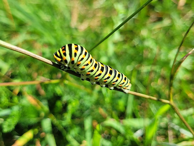 Dies ist die Raupe eines wunderschönen Schmetterlings, des Schwalbenschwanzes (Papilio machaon). Die Raupen werden ca.45 mm lang und sind unbehaart. Anfangs sind sie schwarz mit orangeroten Punkten und einem weißen Sattelfleck. Später, wenn sie ausgewachsen sind,färben sie sich grün und haben schwarze Querstreifen mit gelben oder orangeroten Punkten. Die Schwalbenschwanzraupe frisst am liebsten Doldengewächse wie zum Beispiel Möhre, Petersilie, Dill, Wiesenkümmel oder Liebstöckel. Foto...